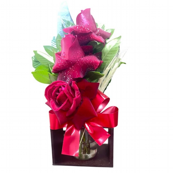 Delicadas rosas colombianas em um vaso de vidro com moldura de madeira, bem cheio de estilo.
