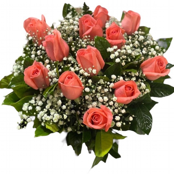 Este buquê é composto por 12 rosas coral — símbolo de admiração, encantamento e paixão delicada. Combinadas com o charme das gypsophilas brancas e folhagens verdes.