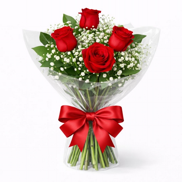 Clássico e elegante, este buquê é composto por 4 rosas vermelhas, com folhagens e acabamento em papel celofane e laço de fita, ideal para expressar amor, carinho e admiração em qualquer ocasião especial.