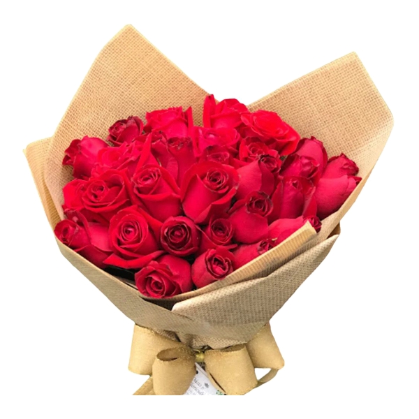 Lindo buquê com 30 Rosas Nacionais vermelhas folhagens e com acabamento com papel Kraft e laço.