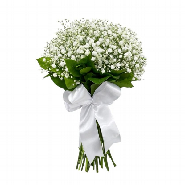 Um buquê pequeno, leve e super elegante, feito com gipsofila (mosquitinho) e folhagens verdes, com delicado acabamento em laço de fita — ideal para quem busca um visual romântico e minimalista em qualquer ocasião.