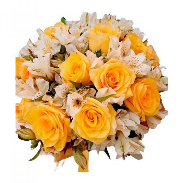 Este maravilhoso buquê (formato redondo) é confeccionado com astromelias branca e rosas amarelas com acabamento de fita de cetim no cabo