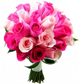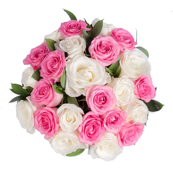 Este maravilhoso buquê (formato redondo) é confeccionado com rosas cor de rosa e rosa branca com acabamento de fita de cetim no cabo