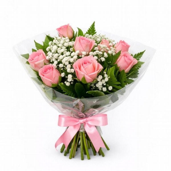 Um buquê lindo e delicado, composto por 10 rosas cor-de-rosa, mosquitinho (gipsofila) e folhagens verdes, cuidadosamente montado para encantar. Vai embalado em papel celofane transparente, com acabamento em laço de fita, pronto para presentear.