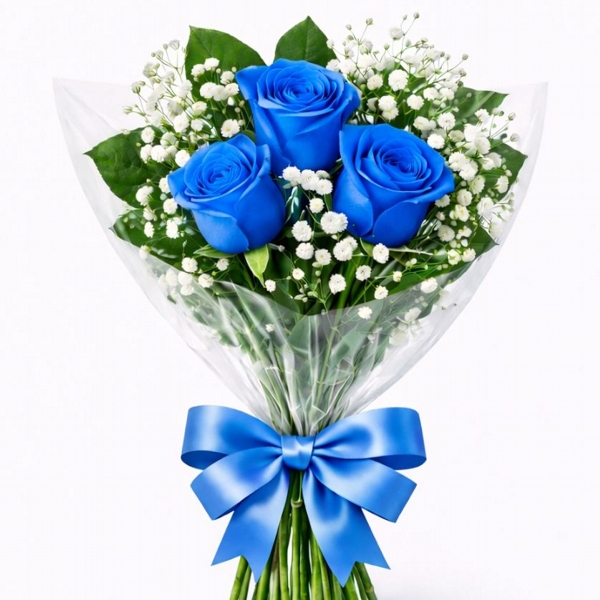 Clássico e cheio de significado, este buquê é composto por 3 rosas Azuis, com folhagens e detalhes de mosquitinho, finalizado com papel celofane e laço de fita. Ideal para demonstrar amor, carinho e admiração em qualquer ocasião especial.