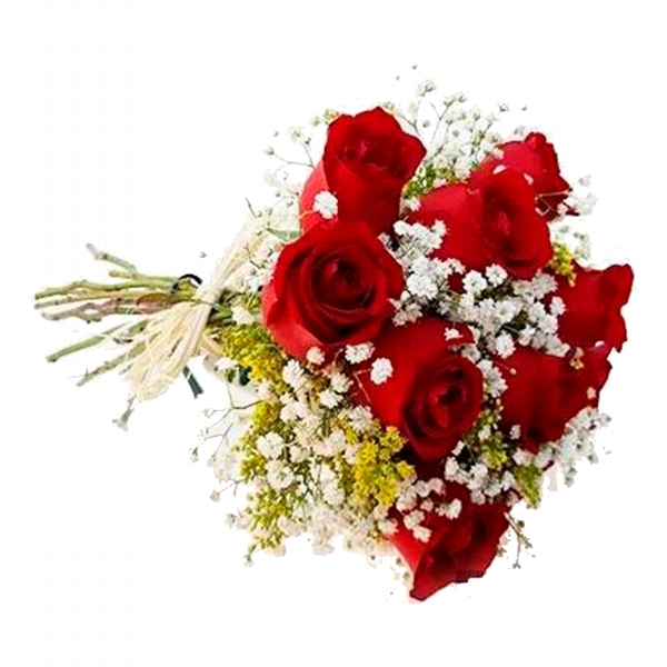 Lindo buquê composto por 10 rosas vermelhas, gipsofila e folhagem embalado em papel celofane e delicado laço de ráfia.