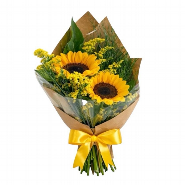 O Buquê Luz do Sol é um arranjo lindo e delicado, composto por 2 girassóis, folhagens verdes e ramos de tango, com acabamento impecável em papel kraft