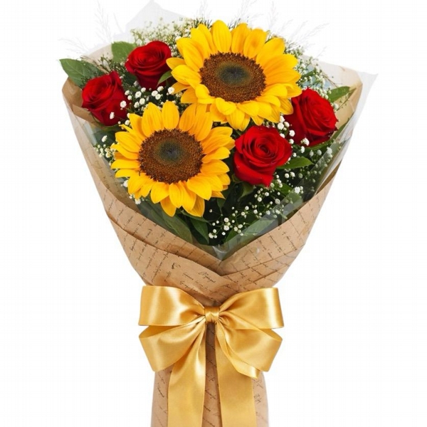 Este buque reúne a imponência dos girassóis e a intensidade das rosas vermelhas, criando um buquê refinado, alegre e inesquecível.