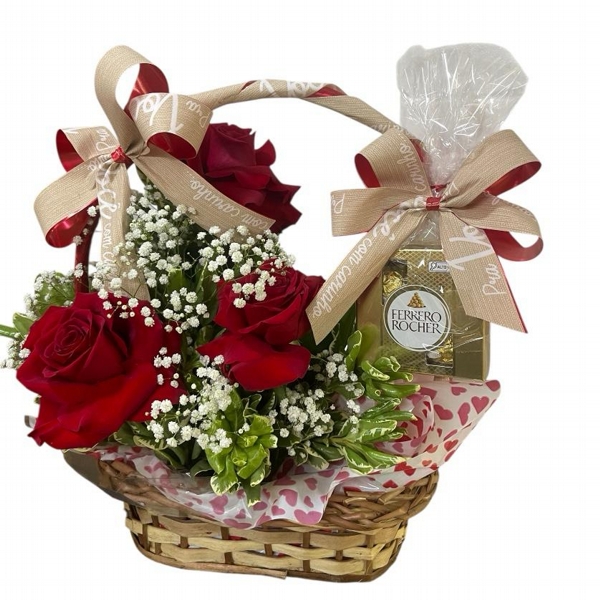 Esta charmosa cesta é composta por 3 rosas vermelhas colombianas, símbolo do amor verdadeiro, cuidadosamente harmonizadas com mosquitinhos (gypsophila) e folhagens selecionadas, criando um arranjo elegante e equilibrado. Para tornar o momento ainda mais especial, acompanha um chocolate Ferrero Rocher, referência em sofisticação e sabor, perfeito para adoçar a surpresa.