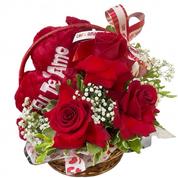 Esta linda composição traz um coração de pelúcia vermelho bordado com a frase “Eu Te Amo”, harmonizado com 3 rosas vermelhas colombianas.