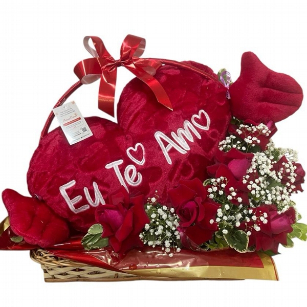 Composta por um lindo coração de pelúcia vermelho bordado com a frase “Eu Te Amo”, esta cesta é acompanhada por 6 rosas vermelhas nacionais, símbolo do amor verdadeiro, delicadamente harmonizadas com mosquitinhos (gypsophila), que trazem leveza e romantismo à composição.