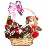 Cesta de Rosas Pelúcia e Placa de Chocolate