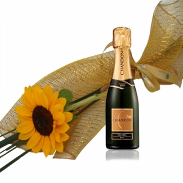 Delicado Girassol embalado em tela dourada acompanhado de uma garrafa de mini Espumante Chandon Baby 187 ml.