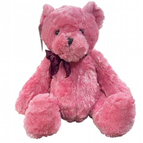 Bichinho de pelúcia no formato de um urso rosa sentado com 60 cm de altura usando um laço no pescoço. Presente para todas ocasiões. Olhos de plástico. Material: poliéster; Enchimento: fibra de poliéster;
