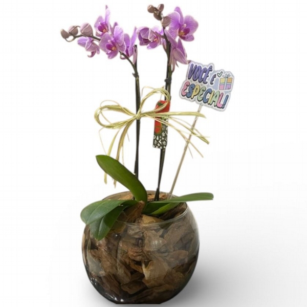 Com flores lilás suaves e duráveis, esta mini orquídea simboliza harmonia, afeto, delicadeza e admiração, sendo ideal para surpreender em momentos especiais. A planta é cuidadosamente acomodada em um vaso de vidro decorativo, com acabamento em casca natural, trazendo charme e modernidade ao ambiente. Acompanha plaquinha decorativa “Você é Especial”, que torna o presente ainda mais afetivo e personalizado.
