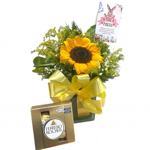 Lindo e delicado vaso de vidro com Girassol e caixa de chocolate ferrero reche quatro unidades