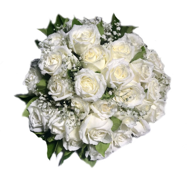 Maravilhoso buquê contendo 30 rosas brancas embalado em papel celofane transparente.