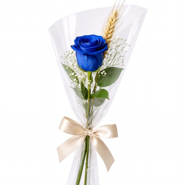 A rosa azul tingida representa sentimentos raros, tranquilidade e exclusividade, enquanto o trigo natural simboliza prosperidade, abundância e bons desejos.