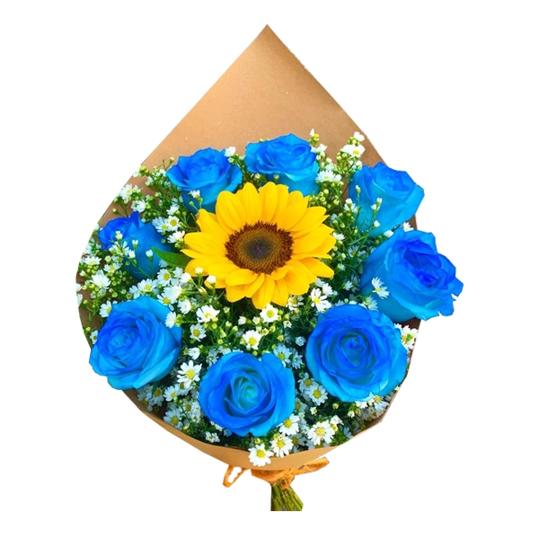 Este é um buquê totalmente diferenciado com 8 rosas azuis e um girassol