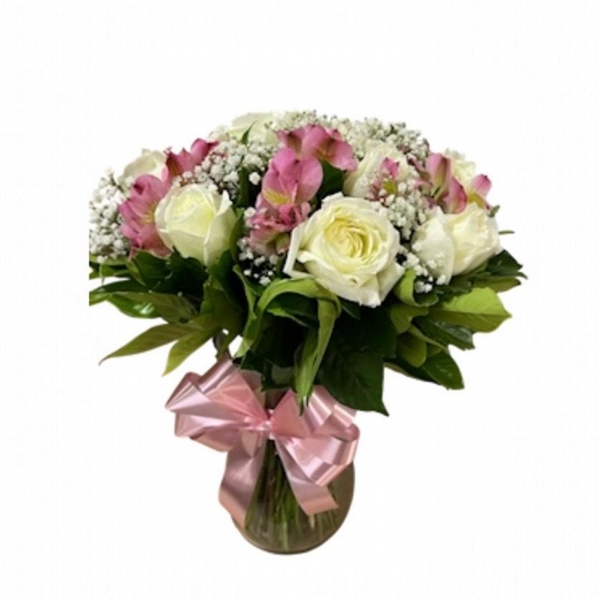 Vaso de vidro com 12 rosas brancas, astromélias cor de rosa e gypsophila, com laço de fita para decorar .