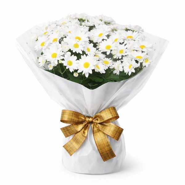 Vaso de margaridas plantadas, embalado em celofane branco e finalizado com laço de fita elegante. Ideal para presentear em qualquer ocasião, transmitindo carinho, leveza e boas energias.